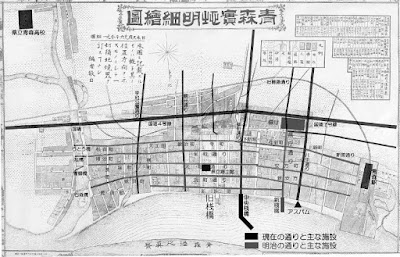 現地にも解説板があったのですが、せっかくなのでネットで見られる地図なども参考にしながら経緯を整理すると、まず明治天皇が船に乗ったという明治初め頃の青森桟橋(旧桟橋)の位置については、青森県立郷土館研究紀要『実測明細絵図から読み解く明治の青森』に収められている1892年(明治25年)の地図で、現在の聖徳公園よりも200メートルほど東(柳町通の一本東の南北の通りの北端)にあったことがわかります。