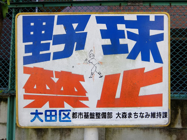 環七通りにもほど近いのですが、周りは住宅などに囲まれて意外に静かな感じです。そうした静かな環境だからでしょうか、園内には妙にカッコいい書体で「野球禁止」が掲げられていました。