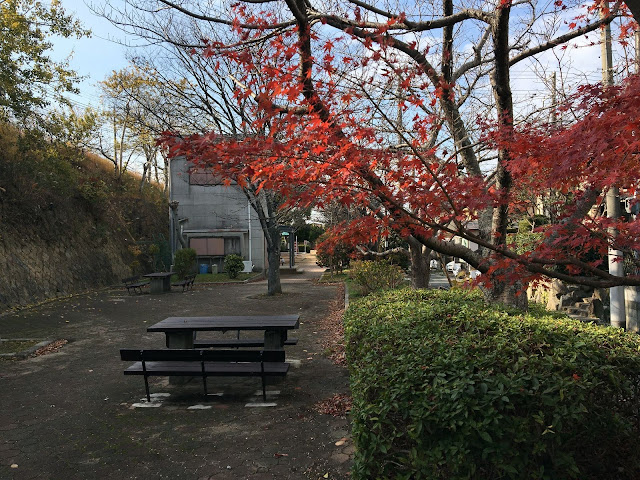 集会所の向こうはだんだん敷地が狭くなるのですが、三角地を上手に使ってベンチやテーブルがいくつか配置されていました。