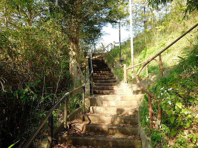 続いて東方向の園地へ。先に書いたように、こちらに来ると急に山っぽくなり、斜面の林の中を縫うような園路の所々に平坦地の小広場があって、そこここに石碑が置かれています。